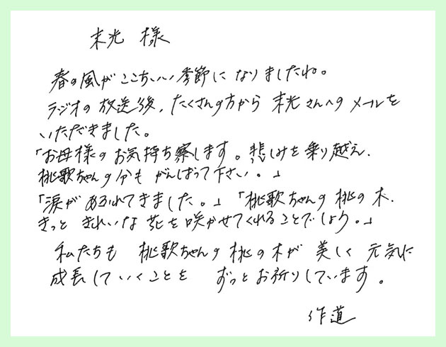 桃歌に何度も会いに来て下さり「一緒に卒業しよな!」